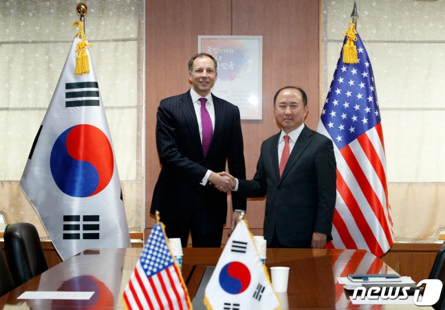 (서울=뉴스1) 안은나 기자 = 윤강현 외교부 경제외교조정관과 프랜시스 패넌 미국 국무부 에너지 차관보가 20일 오전 서울 종로구 외교부에서 면담 전 악수하고 있다. 2019.2.20/뉴스1
