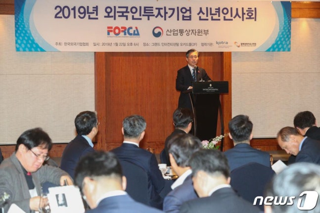 22일 오후 서울 강남구 그랜드인터컨티넨탈호텔에서 열린 2019년 외국인투자기업 신년인사회에서 성윤모 산업통상자원부 장관이 축사를 하고 있다. 2018.1.22/사진=뉴스1 정부가 호주와 뉴질랜드를 대상으로 현지 외국인투자 유치활동에 나서 2억달러 규모의 성과를 거뒀다. 정부는 수소경제, 소프트웨어, 인프라사업 등 이들 국가와 협력할 분야가 많다고 보고 투자유치를 적극적으로 지원하기로 했다.