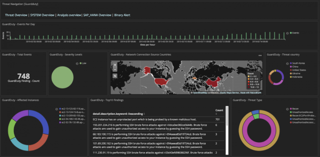 ERP를 위한 보안 영역으로는 IAM, Firewalls, vulnerability Assess, IDS/IPS 등이 가장 중요하게 꼽히는데 대형 클라우드 인프라 제공 벤더와 새로운 클라우드 보안 솔루션들의 경험과 기술은 진화하고 있고 클라우드 MSP 회사가 이를 통합하여 보안의 수준을 높이고 있다. 메가존 클라우드가 AWS 상의 SAP HANA인프라를 보호하기 위해 구성한 서비스가 한 예이다. AWS 상의 ElasticSearh 서비스를 이용하여 로그 데이터를 통합하고 GuardDuty를 이용하여 내외부의 위협 현황을 가시화하여 OS단부터 애플리케이션까지 통합 모니터링한다.
