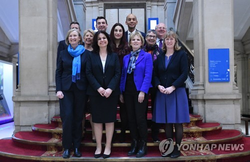 Eleven British politicians who have recently resigned from their respective political parties pose for photographs following a press conference in London, Britain, 20 February 2019. Three Tory MP's Anna Soubry, Sarah Wollaston and Heidi Allen have resigned from the Conservative Party and will join the Independent Group in parliament. EPA/ANDY RAIN