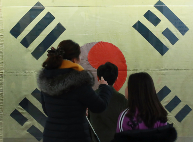 ▲ 전시 개막을 하루 앞둔 지난 21일 서울 종로구 대한민국역사박물관에서 3,1 운동 및 대한민국임시정부 수립 100주년 기념 특별전 '대한독립 그날이 오면' 전시장을 찾은 관람객들이 대한민국 임시 정부의 태극기를 관람하고 있다. ⓒ연합뉴스