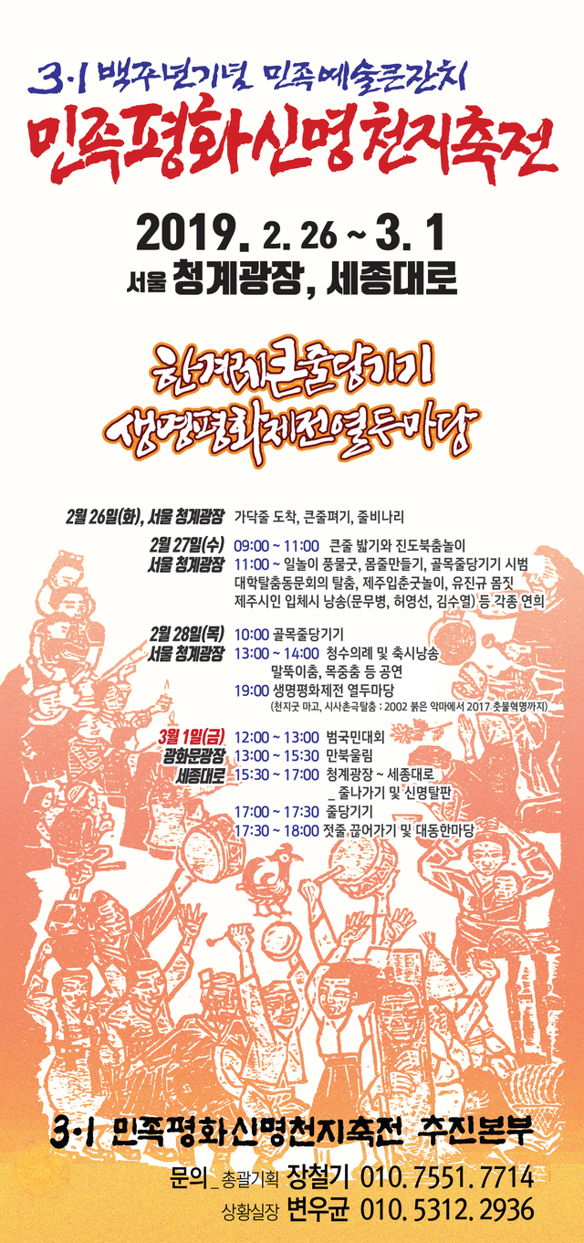 지금 우리는 이 옛 전통을 살려 민족평화를 소구(訴求)하는 역사맞이, 해맞이 굿과 줄당기기를 벌이는 축전을 준비하고 있습니다. 이제 광장은 민족-민중세상을 만드는 문화의 터전이 되어 다가오고 있습니다. 이를 통해 신명나는 민중정서를 드러내고 민족통일을 염원하는 축전으로 승화되기를 기원합니다. 모두 함께 손을 맞잡고 춤을 추며 노래를 부릅시다.