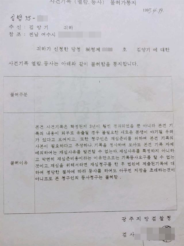 1995년 광주지검이 김양기씨의 국가보안법 위반 혐의 사건기록 열람등사 요청에 보낸 불허가통지. “외부로 유출될 경우 불필요한 새로운 분쟁이 야기될 우려가 있다” “재심사유를 발견할 수 없다”는 불허이유가 담겼다. 김양기 제공