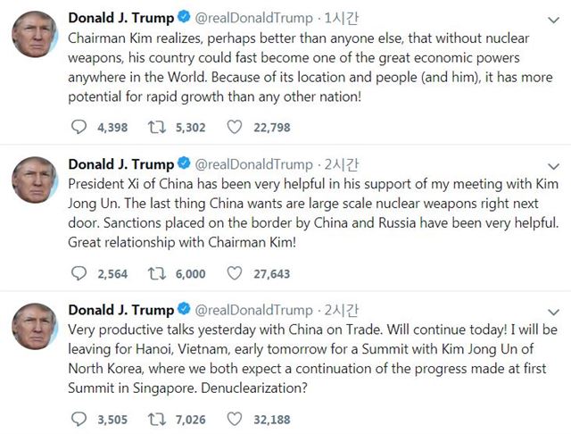 그는 또, 시진핑(習近平) 중국 국가주석에 대해 “시 주석은 나와 김정은의 회담에 매우 큰 도움을 줬다”며 “중국이 가장 원치 않는 건 바로 이웃(나라)에 대규모의 핵무기가 있는 것”이라고 쓰기도 했다. 그러면서 “중국과 러시아가 (북한) 국경 지역에 내린 제재가 아주 도움이 됐다. 김 위원장과는 훌륭한 관계다!”라고 주장했다. 이날까지 이틀 연장된 미중 무역협상과 관련, “매우 생산적인 대화였다”라는 평가도 남겼다.