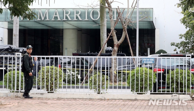 【하노이(베트남)=뉴시스】 김지현 기자 = 25일 오후(현지시각) 북미 정상회담 기간 도널드 트럼프 미국 대통령의 숙소로 거론되는 베트남 하노이 JW메리어트 호텔 앞에서 경찰이 경비를 서고 있다. 2019.02.25. amin2@newsis.com