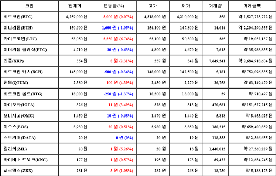 현재 암호화폐 거래소 "코인원"에 따르면 가상화폐 대장 격인 비트코인의 시세는 24시간 전 대비 3,000원(0.07%) 상승한 4,259,000원에 거래되고 있다.