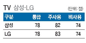 LG 올레드 TV AI ThinQ TV 업종의 NBCI 평균은 78점으로 전년 대비 1점 상승했다. 삼성과 LG는 78점으로 TV 업종 NBCI 공동 1위를 차지했다. 모든 구성요인 점수가 올랐고, 두 브랜드의 인지도, 관계는 전년 대비 2점씩, 이미지는 1점씩 상승했다. 주사용 고객 평가는 삼성과 LG 모두 2점 상승했다. 비사용 고객 평가는 삼성은 1점, LG는 2점 상승했다.