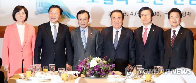 (서울=연합뉴스) 김현태 기자 = 여야 5당 대표들과 문희상 국회의장이 4일 국회 사랑재에서 오찬 간담회를 하기에 앞서 함께 손을 맞잡고 있다. 왼쪽부터 정의당 이정미 대표, 바른미래당 손학규 대표, 더불어민주당 이해찬 대표, 문희상 국회의장, 자유한국당 황교안 대표, 민주평화당 정동영 대표. 2019.3.4
