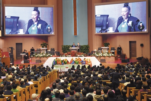 이영훈 목사는 “버니스 킹 목사는 비폭력 인권운동의 주역인 마틴 루서 킹 목사의 딸로 부친의 뜻을 계승하고 있다”고 소개하면서 “건강상 문제로 장거리 여행이 힘듦에도 교회를 방문해 하나님 말씀을 전해주어 감사하다”고 인사했다.