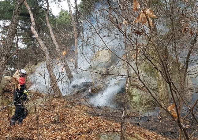 소방·산림 당국은 헬기 4대, 산불진화대 등 인력 70여명을 동원해 진화작업을 벌여 이날 오후 5시 10분께 큰 불길을 잡았다.