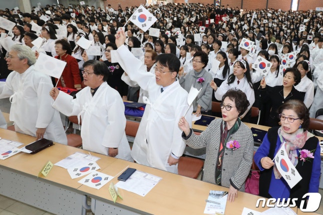 (대구=뉴스1) 공정식 기자 = 8일 대구 중구 동산동 신명고에서 열린 ‘신명 3·8 독립만세운동 100주년 기념식’에서 성명여중·신명고 학생들과 교직원, 독립유공자 후손 동문 등 참석자들이 태극기를 흔들며 3·1절 노래를 제창하고 있다. 이날 기념식은 1919년 3·8 독립만세운동 등 지역의 항일독립운동을 주도했던 선배들의 역사의식을 계승하기 위해 마련됐다. 2019.3.8/뉴스1