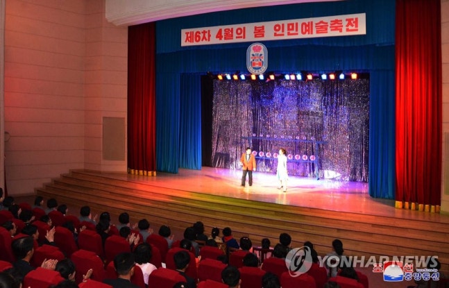 (평양 조선중앙통신=연합뉴스) 제6차 4월의 봄 인민예술축전 참가자들의 태양절경축공연이 15일 평양대극장, 봉화예술극장, 국립연극극장, 인민문화궁전, 청년중앙회관, 천리마문화회관, 철도성문화회관, 국립교예단 요술극장에서 진행되었다고 조선중앙통신이 16일 보도했다. 2019.4.16