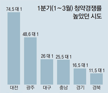 대전과 광주, 대구 등 일부 광역시에서만 청약 열기가 이어졌다. 1분기 대전의 평균 청약 경쟁률은 74.5 대 1로 전국 시도 가운데 가장 높았다. 광주(48.6 대 1), 대구(26 대 1)의 경쟁률도 높았다. 덕분에 지방 광역시 전체 청약 경쟁률도 지난해 4분기 25.3 대 1에서 올해 1분기 38.2대 1로 상승했다. 대전, 광주는 지난해 오른 집값이 올해도 유지되는 데다 활발한 정비사업으로 도심 내 인기 지역 분양이 많았던 영향으로 풀이된다.