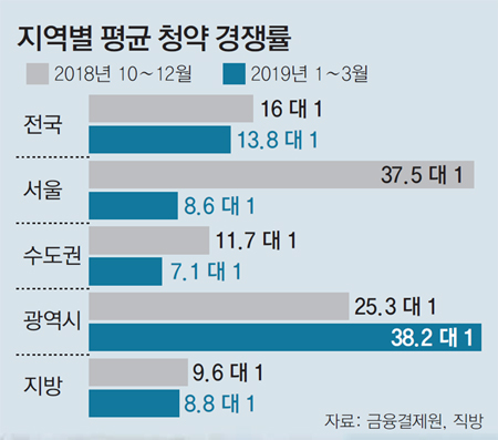 15일 직방이 금융결제원의 청약 시스템 아파트투유 자료를 분석한 결과 올 1분기 전국의 평균 청약 경쟁률은 13.8 대 1로 지난해 4분기(10∼12월)의 16 대 1보다 낮아졌다. 특히 서울의 청약 경쟁률은 8.6 대 1로 전 분기 경쟁률(37.5 대 1)의 4분의 1에도 미치지 못했다. 지난해 서울의 분기별 청약 경쟁률은 줄곧 25 대 1을 웃돌았다. 지난해 9·13부동산대책 이후 전체 주택시장의 관망세가 짙어진 데다 지난해 말 무주택자 중심의 새 청약제도가 도입됐기 때문이라고 직방은 분석했다.