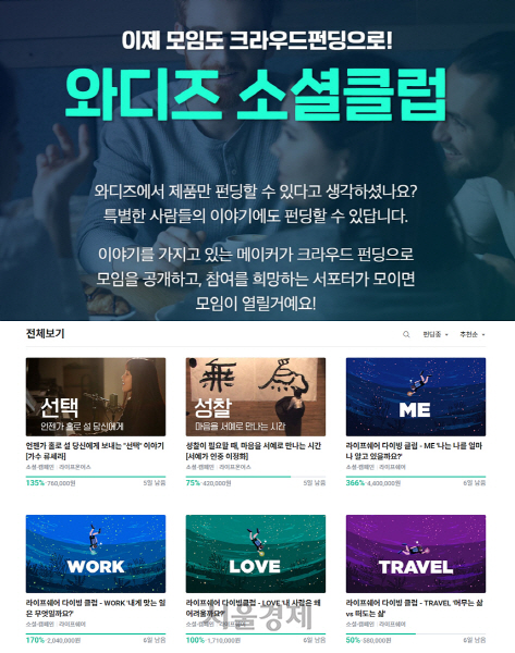 와디즈는 크라우드펀딩을 통해 모임을 개설할 수 있는 모임문화 관련 프로젝트 ‘소셜클럽’을 새롭게 선보인다고 16일 밝혔다. 이번 프로젝트는 이야기를 지닌 메이커가 크라우드펀딩으로 모임을 공개하고 참여를 희망하는 서포터가 모이면 실제 모임이 진행되는 것으로 단순 제품 제작 또는 서비스 출시를 위한 펀딩을 넘어 연결을 통한 새로운 만남의 장을 마련하기 위해 기획됐다.