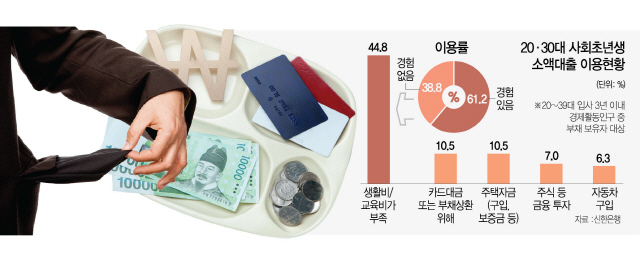 원금 300만원 이하 소액대출 이용률도 61.2%로 다른 연령대보다 높았다. 주된 이유는 ‘생활비와 교육비 부족(44.8%)’이었고 ‘카드대금 및 부채상환’ ‘주택 자금’을 위한 대출이라는 응답도 각각 10.5%를 차지했다. 실제로 대출을 받은 사회초년생들의 소비액은 식비(28만→36만원), 월세(28만→36만원), 교육비(19만→27만원) 등의 필수 소비 항목에서 2017년과 비교해 크게 늘었다.