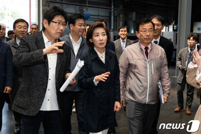 (인천=뉴스1) 유승관 기자 = 나경원 자유한국당 원내대표가 17일 인천 남동구 남동국가산업단지 내 금속가공업체 (주)인페쏘를 찾아 소득주도성장 폐기 경제활동 특별위원회 현장간담회에 앞서 공장을 둘러보고 있다. 2019.4.17/뉴스1
