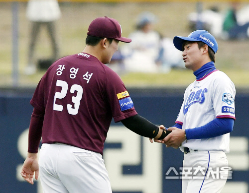 삼성 김상수가 16일 포항 키움전을 앞두고 장영석을 만나 인사하고있다. 2019.04.16. 포항