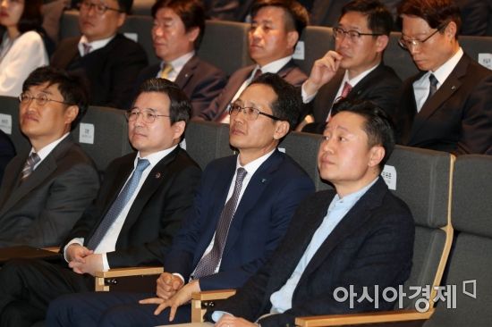 18일 서울 KEB하나은행 을지로 본점에서 열린 핀테크랩 1Q Agile Lab 8기 출범식에서 김용범 금융위원회 부위원장(앞줄 왼쪽 두 번째)과 지성규 하나은행장(세 번째)이 출범 영상을 보고 있다. /문호남 기자 munonam@