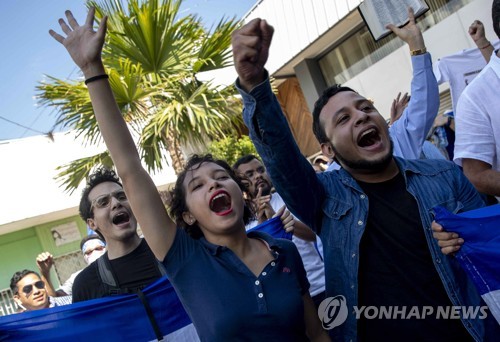 Demonstrators shout slogans during an opposition's anti-Government protest, in Managua, Nicaragua, 17 April 2019. EPA/Jorge Torres