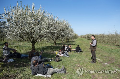 Seasonal workers listen to the briefing by Roland Szakacs at the family's fruit farm in Tiszadob, Hungary, 18 April 2019. Farm owner Bela Szakacs and his wife, Belane Szakacs are consciously preparing to hand over their agricultural business 'Mikef Ltd.' to their children Renata Harsanyine Szakacs and Roland, who participate in the work on daily basis. Renata left her office work one year ago, while Roland gave up his presidential duties at the Water Polo Association to deal with the family owned 160 hectare business. EPA/Attila Balazs HUNGARY OUT ATTENTION: This Image is part of a PHOTO SET