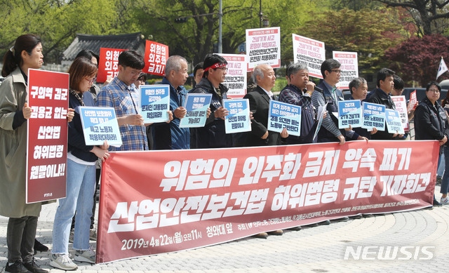 【서울=뉴시스】박미소 수습기자 = 이상진(오른쪽 여섯번째) 민주노총 부위원장이 22일 오전 서울 종로구 청와대 분수대 앞에서 열린 '위험의 외주화 금지 약속 파기 산업안전보건법 하위법령 졸속 입법예고 규탄 기자회견'에서 발언하고 있다. 2019.04.22.
