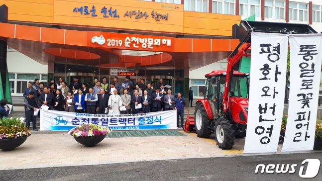 '통일트랙터 품앗이 순천운동본부'가 24일 전남 순천시청 앞에서 대북제재 해제와 자주교류 실현의 마중물이 될 '통일트랙터 출정식' 행사를 진행하고 있다.2019.4.24/뉴스1 © News1