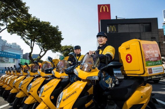 맥도날드 전기 바이크의 모습. [사진=연합뉴스]서울시와 프랜차이즈, 배달 업체가 배달용 엔진이륜차의 친환경 전기이륜차 전환을 위해 손을 잡는다.