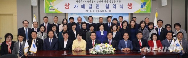 【서울=뉴시스】정순균 강남구청장이 26일 경기도 광주시청에서 열린 '강남구-광주시 자매결연 협약식'에서 신동헌 광주시장과 협약 체결 후 참석자들과 기념촬영을 하고 있다. 2019.04.26. (사진=강남구 제공)